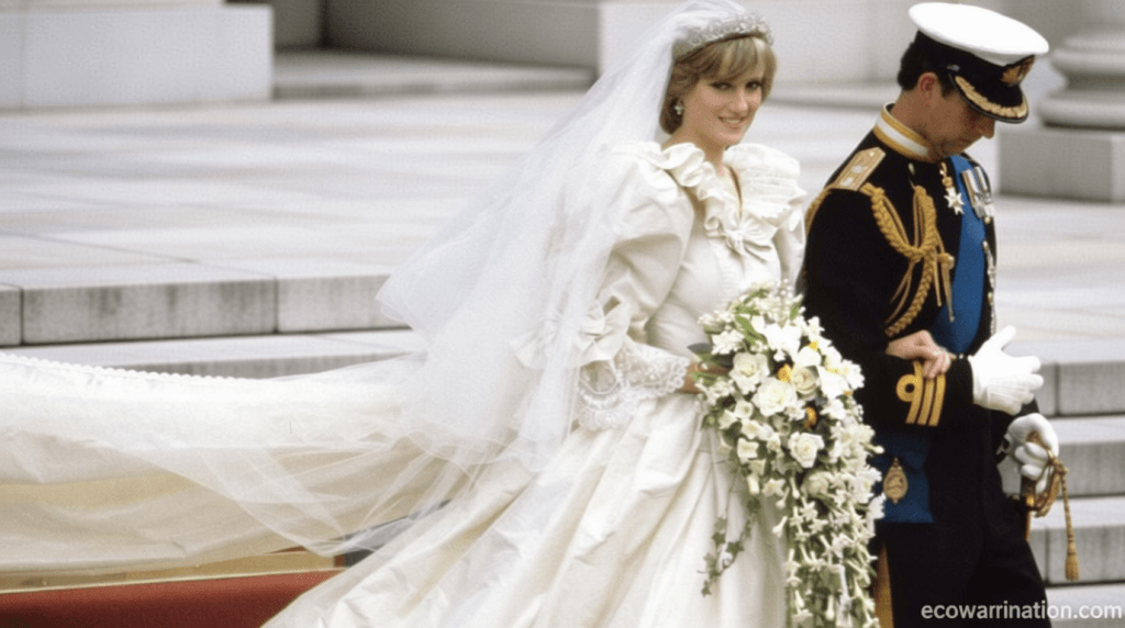 In 1981, Lady Diana Spencer made her entrance at St Paul’s Cathedral, where her wedding to Prince Charles was broadcast to an estimated 750 million viewers globally. The ivory silk taffeta and lace bridal gown, crafted by David Emanuel and his wife Elizabeth, remains an iconic symbol of that historic moment.
